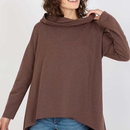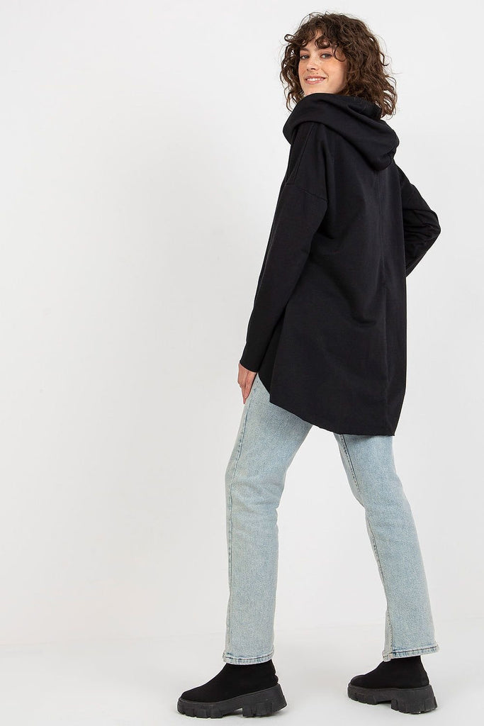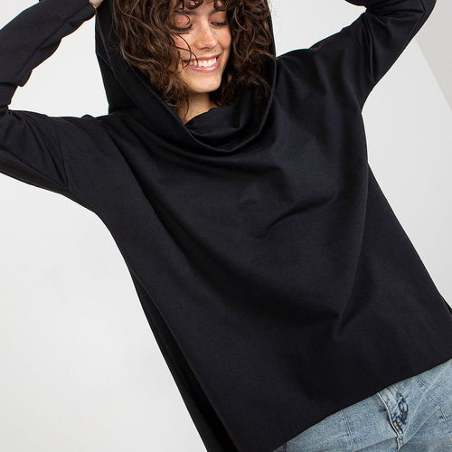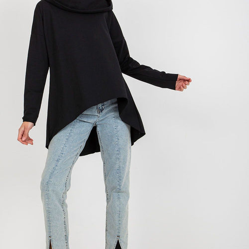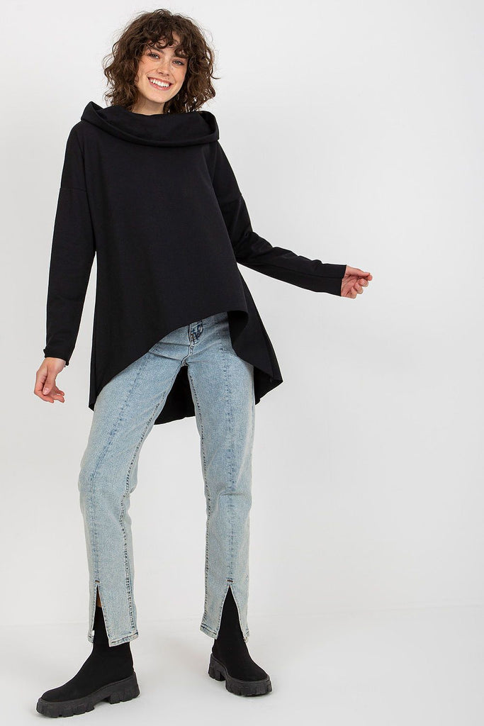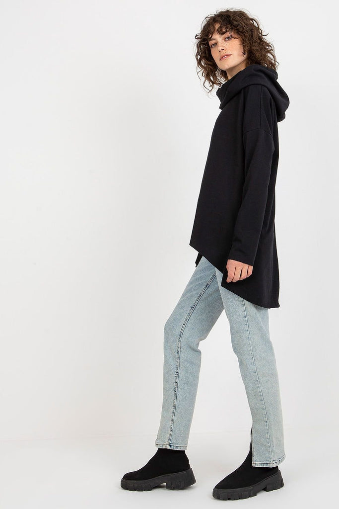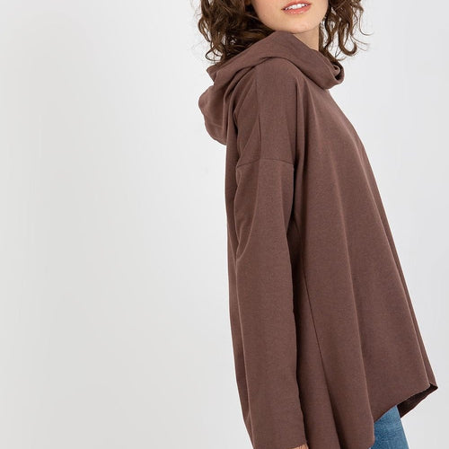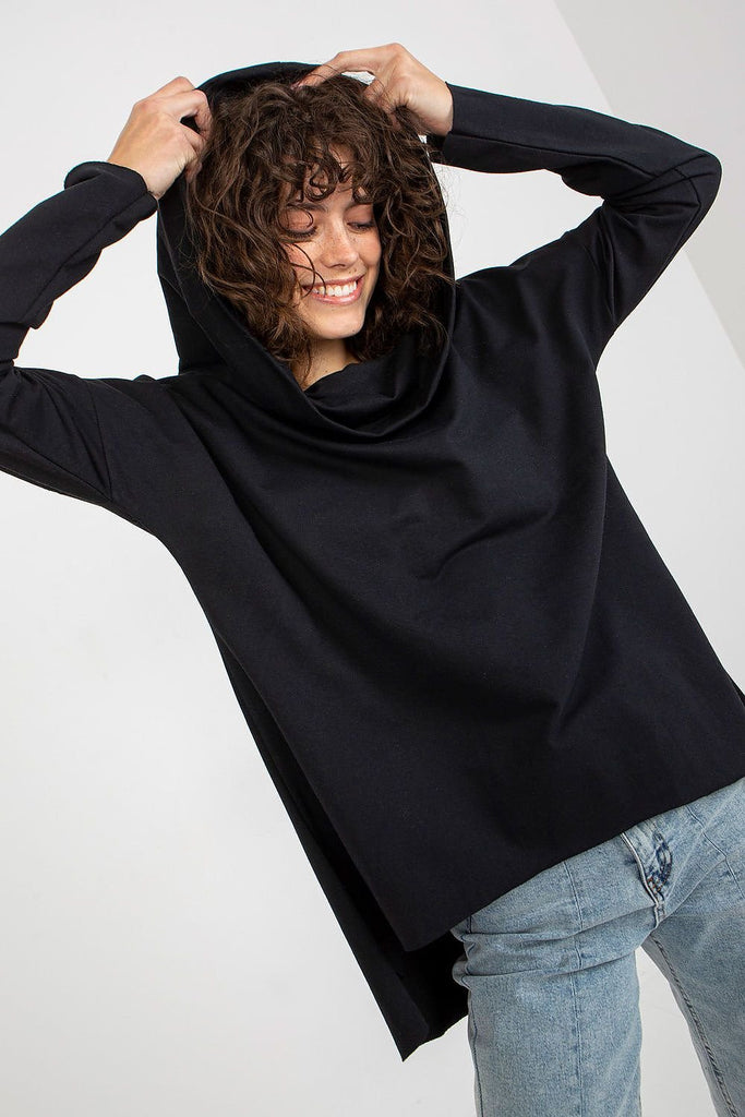 Women's sweatshirt with a loose fit, long sleeves and a hood. The bottom of the sweatshirt is asymmetrical, the back is longer. Cotton 72 % Spandex 6 % Polyester 22 % Size Total length Chest one-size-fits-all 63/84 cm 128 cm