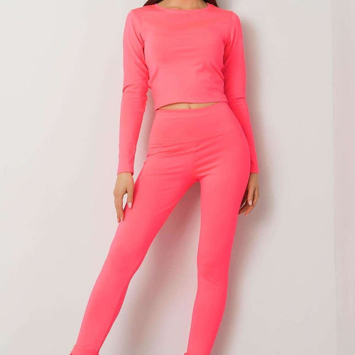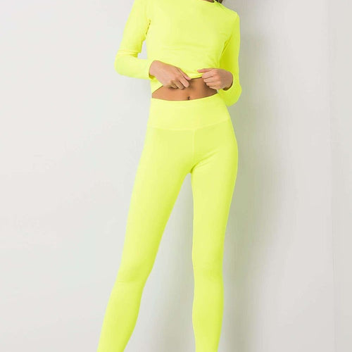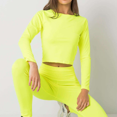 Sports set consisting of a blouse and leggings. Short blouse with long sleeves, leggings with wide elastic waistband. Spandex 10 % Polyester 90 % Size Lenght Chest Waist S/M 44/96 cm 74 cm 64 cm