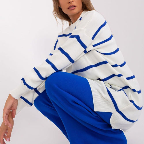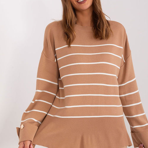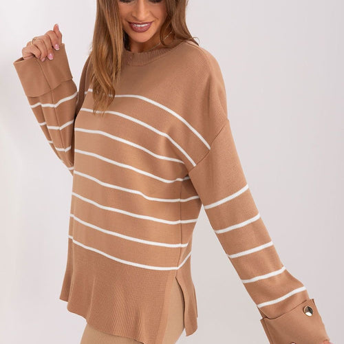 This casual striped sweater is a great choice for everyday occasions. Made of soft and warm material with 100% acrylic composition, it guarantees comfort and convenience. Its long sleeve with decorative buttons adds charm and originality, while the round neckline gives it a classic look. The sweater has a standard length, which makes it suitable for a variety of outfits....