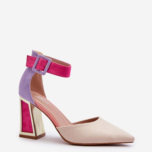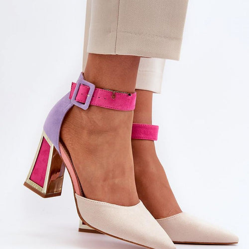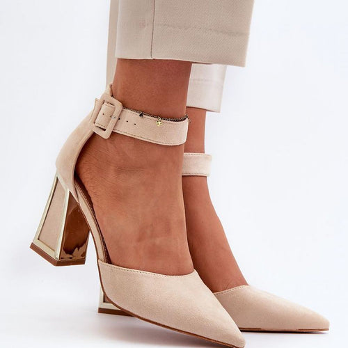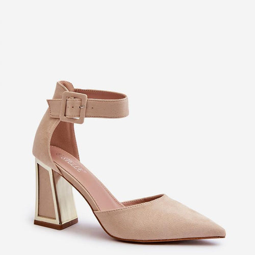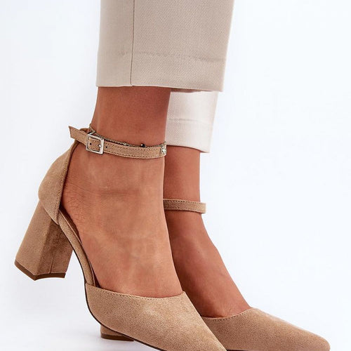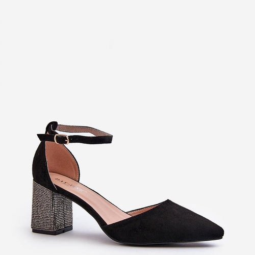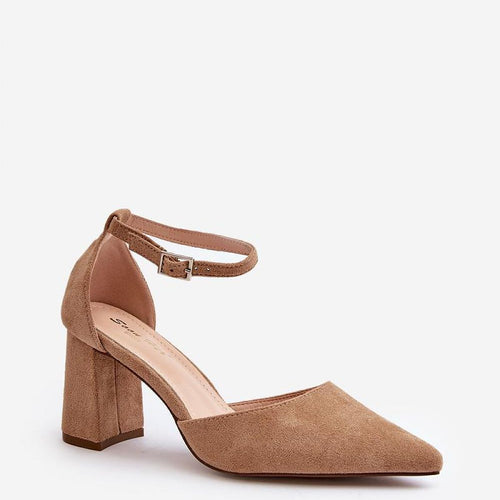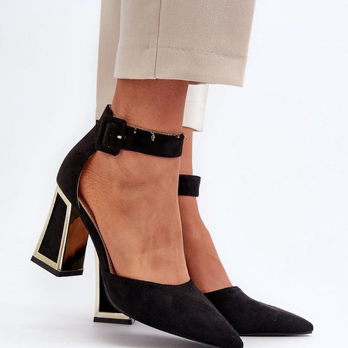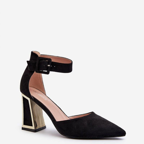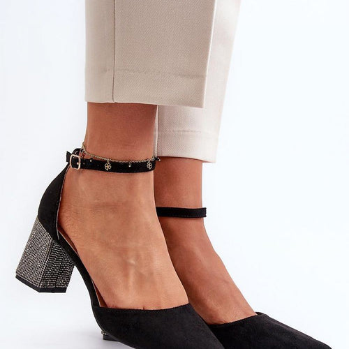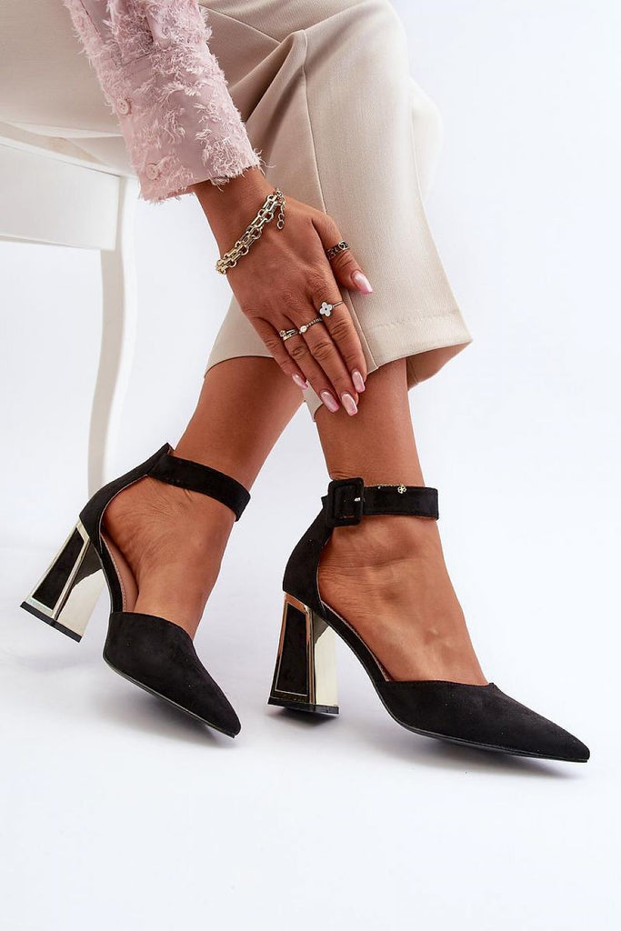 Elegant women's pumps on an ornate stiletto heel. Made of eco-suede. Fastened with an adjustable strap with a buckle. Pointed nose optically slenderize legs, emphasizing the elegance of any styling. Perfect for various celebrations and evening outings. fabric imitation leather suede Footbed artificial leather Heel height 7 cm Size Insole lenght 36 23.5 cm 37 24 cm 38 24.5 cm...