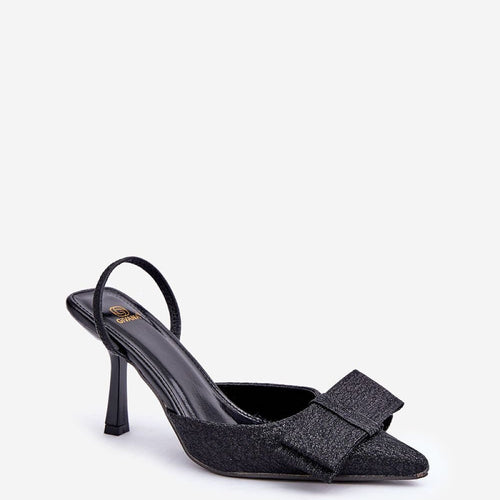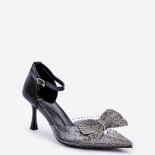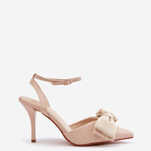 Women's stilettos made of eco leather. The model is distinguished by pointed toes, which add a chic touch, and an adjustable strap with a buckle for a perfect fit. The front of the shoe is decorated with a large, impressive bow, emphasizing the unique character of the stilettos. Perfect for evening outfits! fabric artificial leather Footbed artificial leather Heel height...