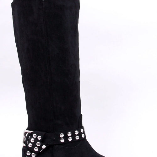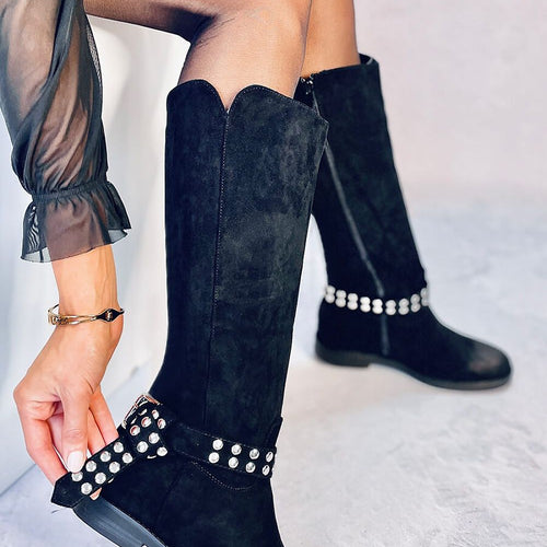 Women's boots - jackboots on a flat sole. The boots have a timeless cut with a striking studded belt (it can be removed). We can not resist them : ) Practical zipper closure ensures comfortable putting on. They are made of eco-suede, on a foam lining. fabric ecological suede warmers foam padding Heel height 2,5 cm Size Insole lenght 36...