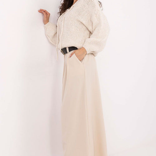 Comfortable and stylish women's trousers with a loose fit, perfect for everyday wear. Made of soft polyester, they provide comfort and freedom of movement. The model has a high waist with an elastic band, which allows for a great fit to the silhouette and emphasizes the waist. The trousers have side slip pockets and open back pockets, which adds practicality....