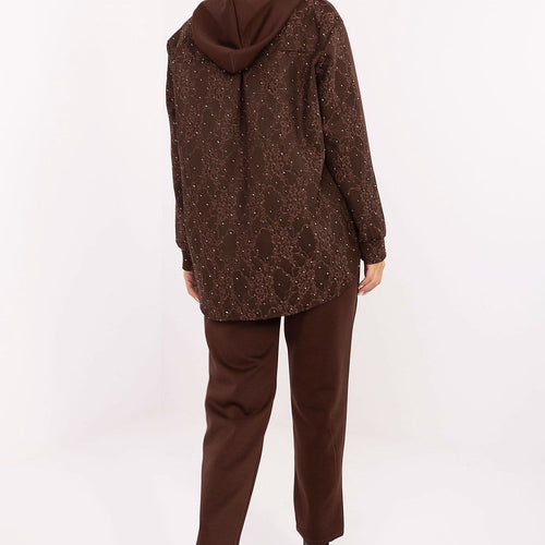 Stylish and comfortable women's set in a casual style, perfect for everyday wear. Made of high-quality blend of viscose and elastane, it is elastic, breathable and exceptionally pleasant to the touch, providing maximum wearing comfort. The set includes a hoodie and pants with long, tapered legs. The hoodie stands out with decorative jet application and lace inserts on the back,...