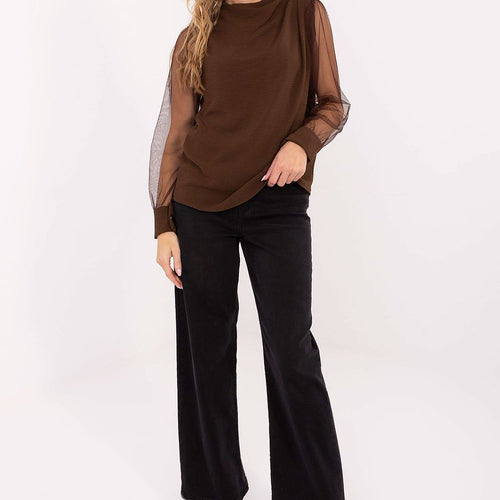 Elegant blouse with a subtle, feminine style, perfect for formal occasions and work. Made of smooth fabric that is a blend of polyester and elastane, providing comfort and gently fitting the silhouette. The blouse has a round neckline, and its decoration is eye-catching, long mesh sleeves that add lightness and elegance. Puffy sleeves with decorative pleats on the shoulders and...