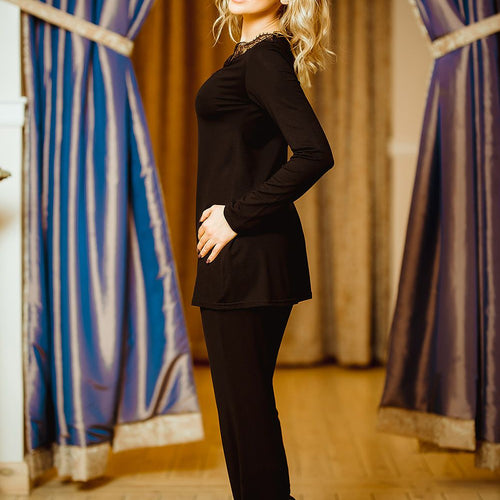 To meet the current trends in which pajamas not only serve as clothing for sleeping but also as home clothes, we created the Pangkor set. Made of comfortable viscose with elastane not only provides comfort but also ensures no deformation. The set consists of a long-sleeved blouse decorated with a tulle frill and trousers with two pockets, also with a...