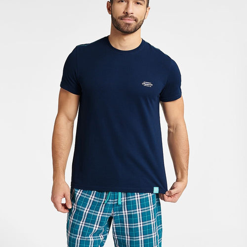 The two-piece navy blue men's FLEET pajamas are a perfect choice for lovers of minimalism. The set consists of a short-sleeved T-shirt and shorts in navy blue melange. On the T-shirt there is a white inscription with the brand logo, which breaks the uniform design of the set. The fashionable men's FLEET pajamas are made of a pleasant-to-touch fabric that...