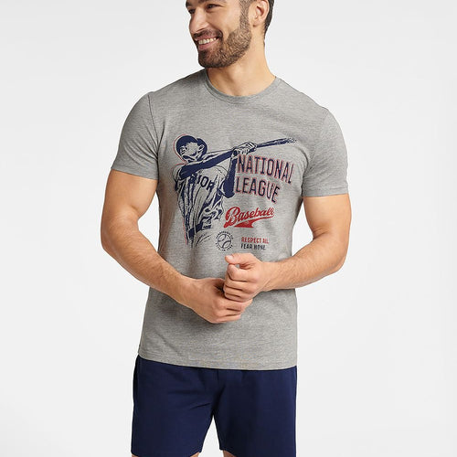 FLAIR men's cotton pajamas in sporty style are an option for any activity lover. The set includes a gray T-shirt and navy blue short shorts. The T-shirt features a baseball player print. The FLAIR two-piece men's set is not only pajamas, but also a casual outfit and a comfortable set for running or the gym. The T-shirt and shorts are...