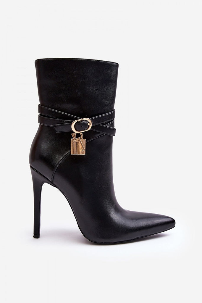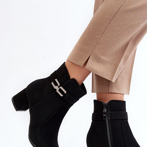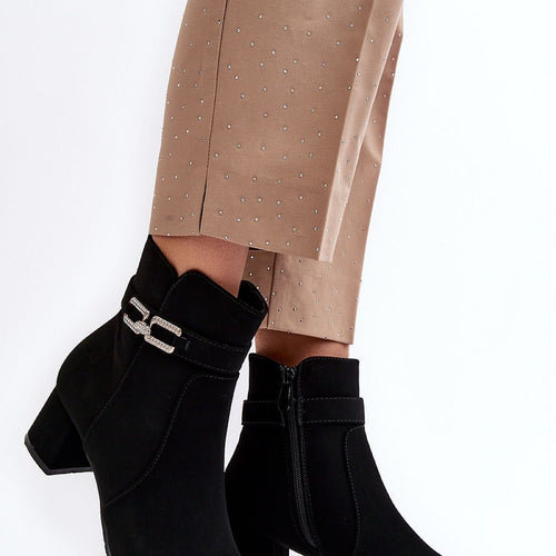 Elegant women's boots made of eco leather. Model with a higher upper. Zippered at the side. Pointed nose will optically slenderize the legs. The upper is enriched with stripes and a plastic ornament. The center is slightly insulated with shoe blanket. The boots will go well with many styles, for example: with dresses, skirts or pants. They should definitely find...