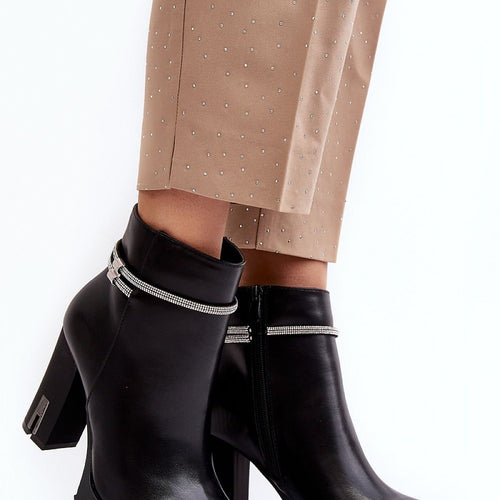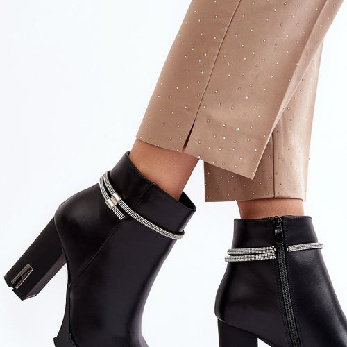 Women's boots made of eco leather. Set on a platform and a heel in the form of a post. This model is fastened with a zipper on the side of the upper. Rounded nose pads. Stiffened heel counter. Soft insole will ensure comfortable use of the footwear. Upper decorated with a strap with small, shiny zircons. Perfect for autumn styling!...
