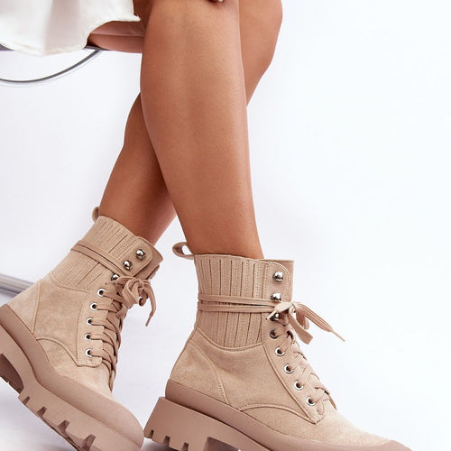 Women's trappers made of eco-suede. Lace-up model. Set on a thick sole and a flat heel. Rounded toe. Ankle length upper. Insulated with shoe blanket. Stiffened heel counter. You will use this classic model for many autumn-winter stylizations! fabric imitation leather suede warmers shoe cover Footbed shoe cover Upper height 15 cm Heel height 6 cm Sole height 4.5 cm...
