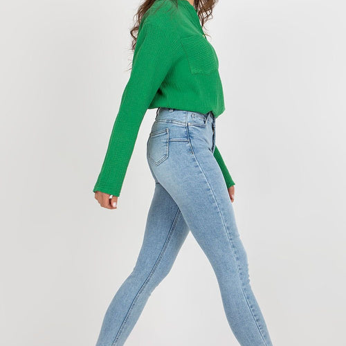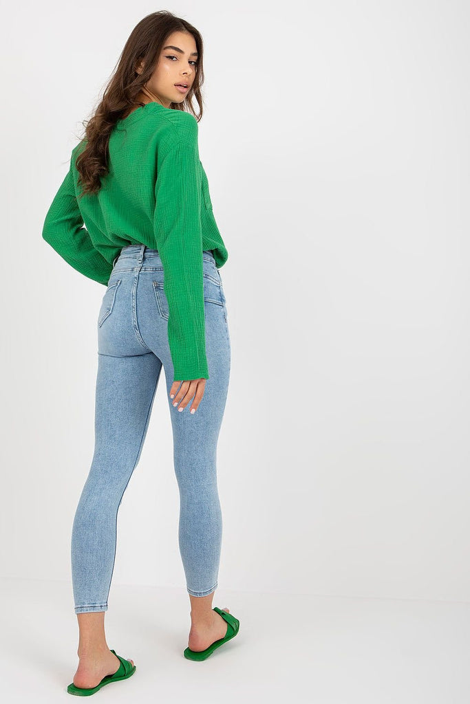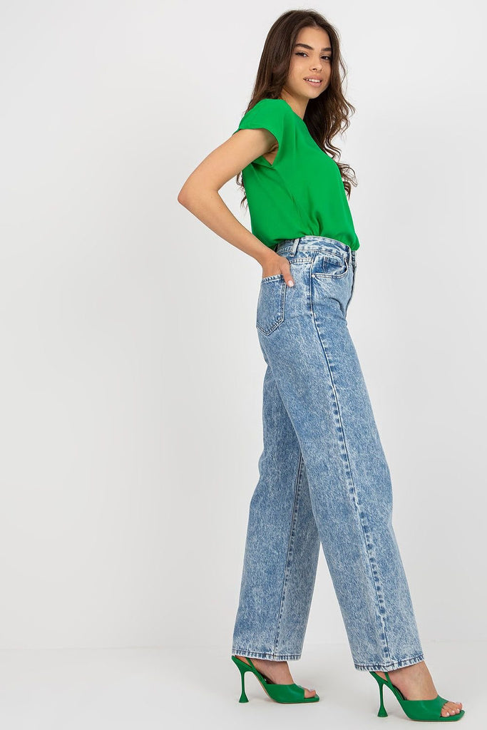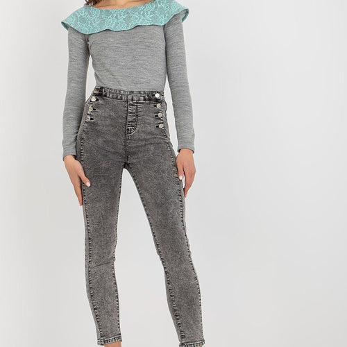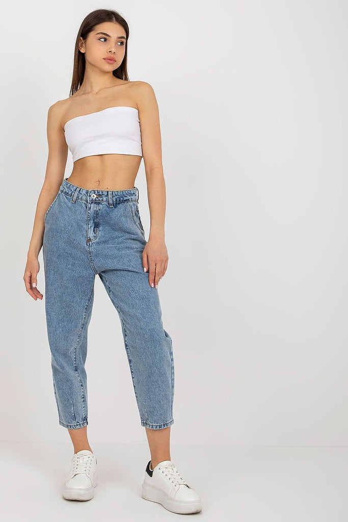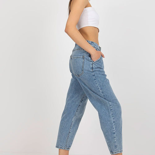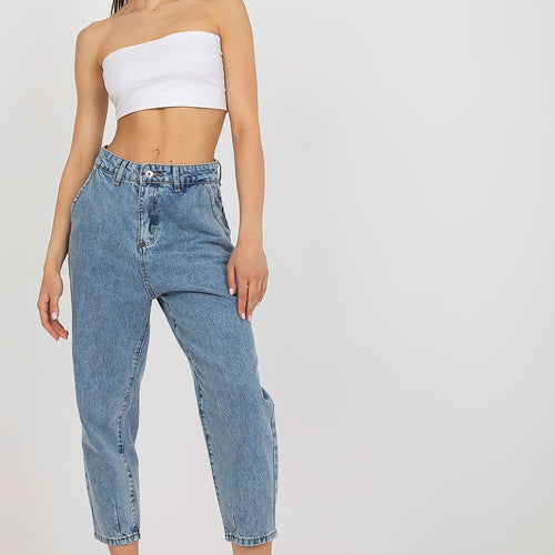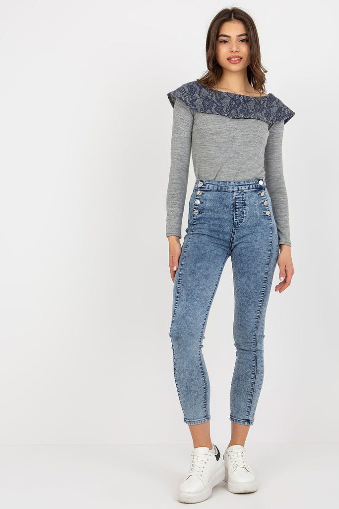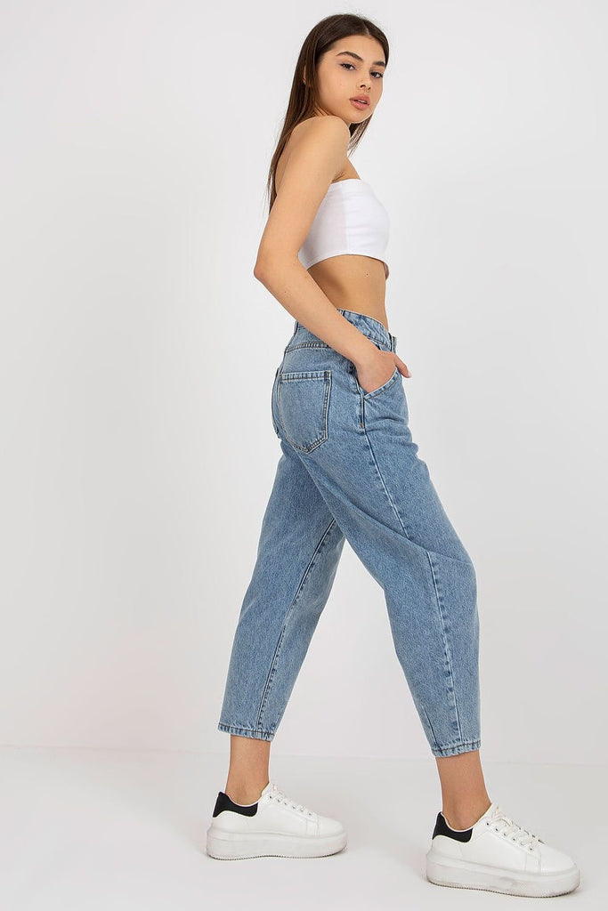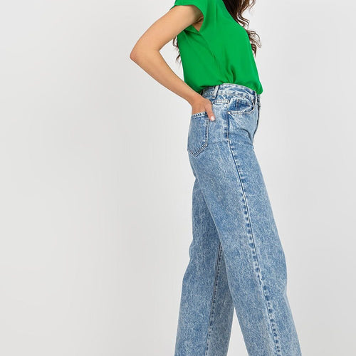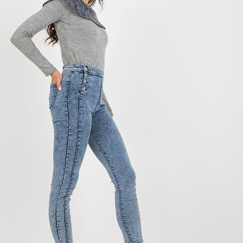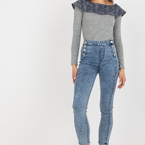 Women's high-waisted jeans with zipper and button closure. Slip-on pockets on the sides and back. Cotton 100 % Size Hips width Waist width M 98-101 cm 70-73 cm S 94-97 cm 66-69 cm XS 90-93 cm 63-65 cm