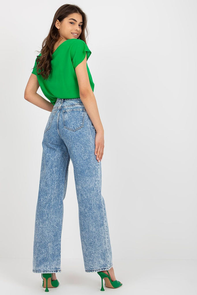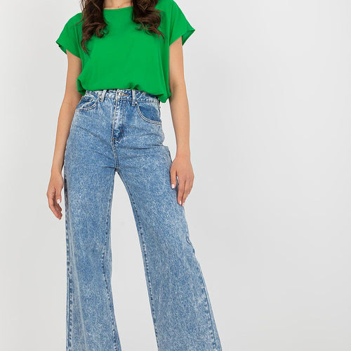 Women's high-waisted jeans with zipper and button closure. Legs with a flared cut. On the front and back slip pockets. Cotton 100 % Size Hips width Waist width M 98-101 cm 70-73 cm S 94-97 cm 66-69 cm XS 90-93 cm 63-65 cm