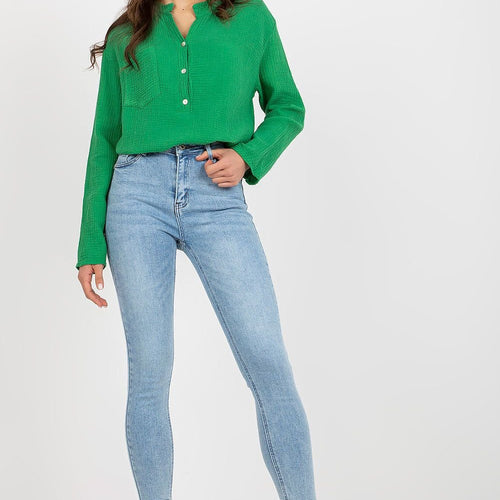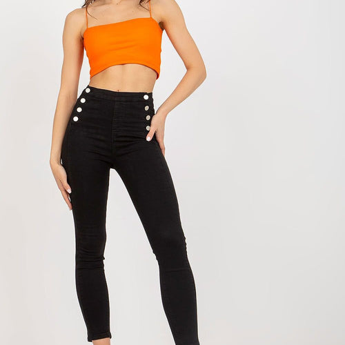 Women's jeans with a tailored fit with a button closure. Slip-on pockets at the back. Cotton 70 % Spandex 2 % Polyester 28 % Size Hips width Waist width L 102-105 cm 74-77 cm M 98-101 cm 70-73 cm S 94-97 cm 66-69 cm XL 106-109 cm 78-81 cm XS 90-93 cm 63-65 cm