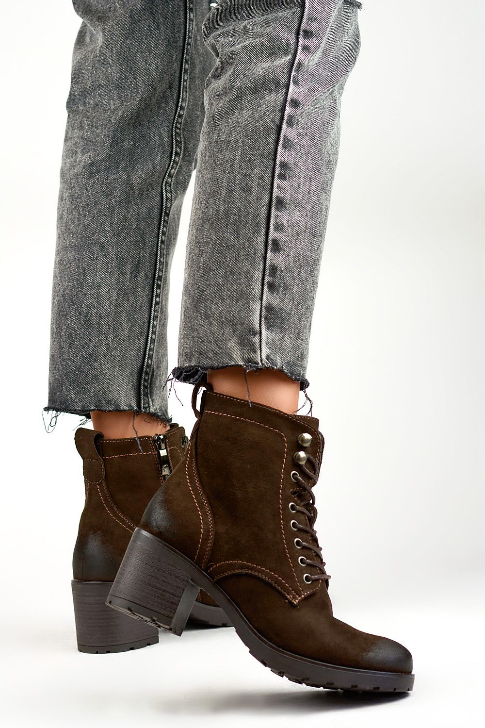 These lovely boots in a warm shade of brown are the perfect choice for the autumn/winter season. Designed especially for women, they combine stylish design, comfort and functionality. The upper of the boots is made of durable eco-suede, giving them an elegant look. The height of the upper of 13 cm provides additional protection against cold and moisture, ideal for cold days. The interior of the boots is lined with shoe blanket, making them pleasant and warm to wear. Additional warming guarantees comfort during colder days. A stable heel in the form of a 6 cm high post adds a feminine touch to the boots and provides stability to the step. The boots have a practical zipper closure and additional lacing, which allows for easy putting on and customization. The round toe makes these boots comfortable and suitable for many outfits. The brown color adds to their timeless charm, blending perfectly with the autumn-winter color palette.