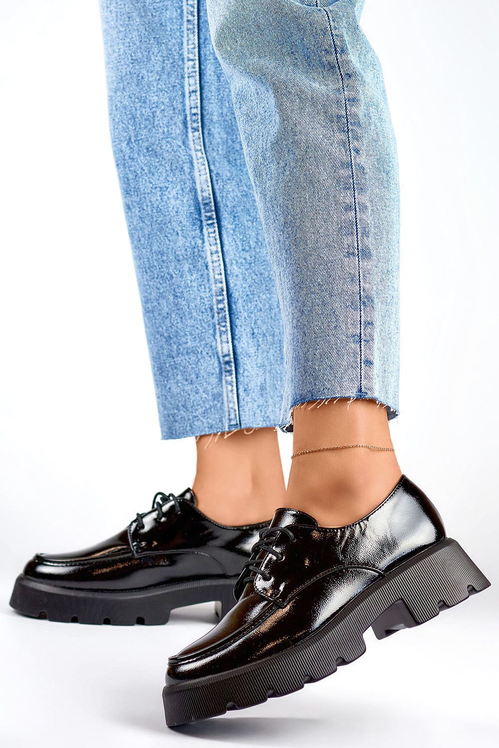 Semi-boots in a deep, elegant shade of black are a combination of style and functionality, dedicated to modern women who want to emphasize their femininity in every step. The upper made of patent leather gives the shoes a unique shine, making them not only a fashionable styling element, but also an elegant addition to a variety of outfits. Created with women in mind, these black half-shoes are ideal for spring and summer, but thanks to their timeless design, they will also work well all year round, adding chic and class to a variety of occasions. The leather insole ensures comfortable wearing, adapting to the shape of the foot. These half-boots have a stable heel of 4.5 centimeters, which gives them elegance, while remaining a comfortable option for everyday wear. Lacing allows the shoes to be precisely adjusted to individual preferences, and the round toe adds a classic charm. The black half-boots are not only a sophisticated choice, but also a versatile accessory that will easily match different styles and occasions.
