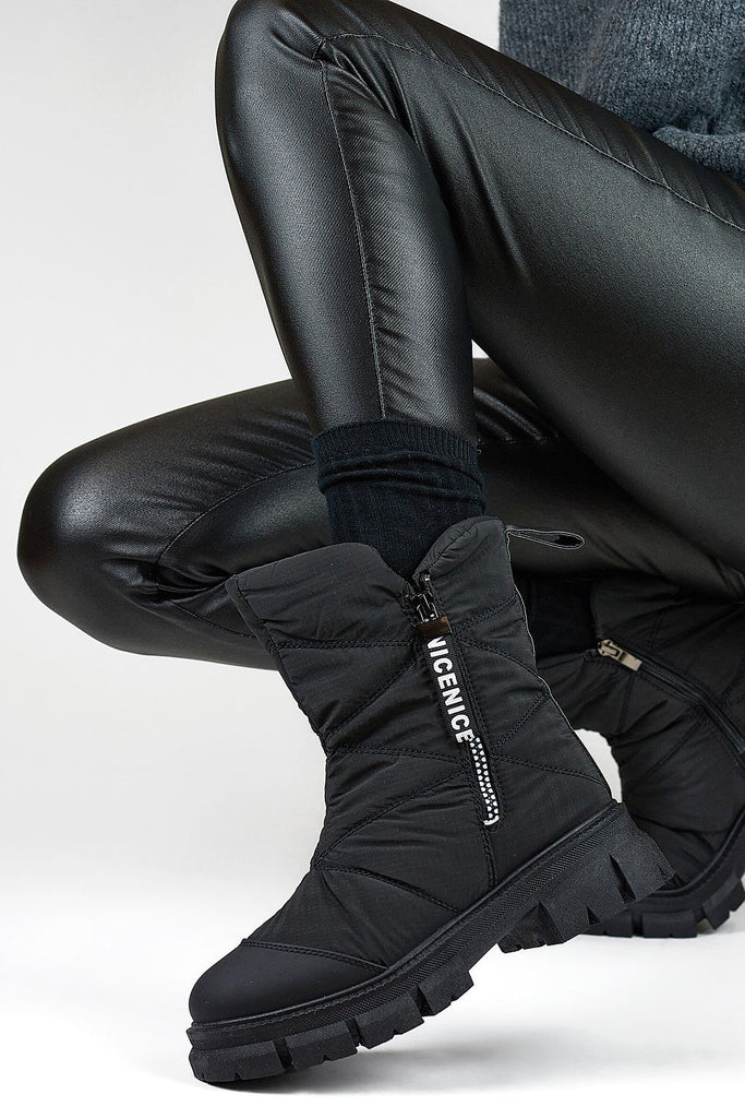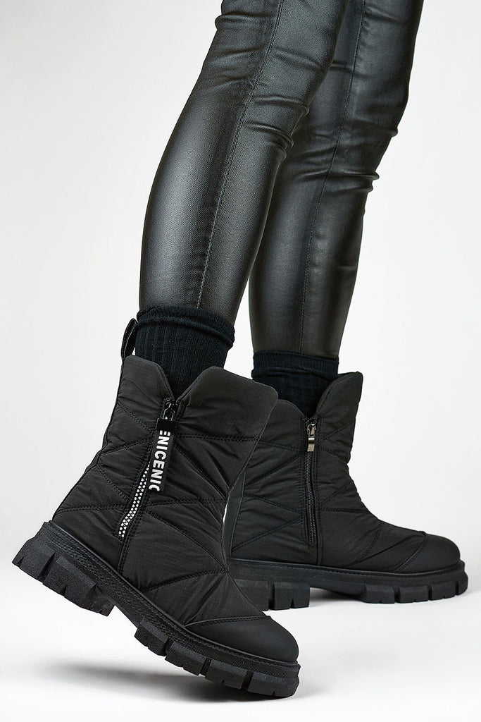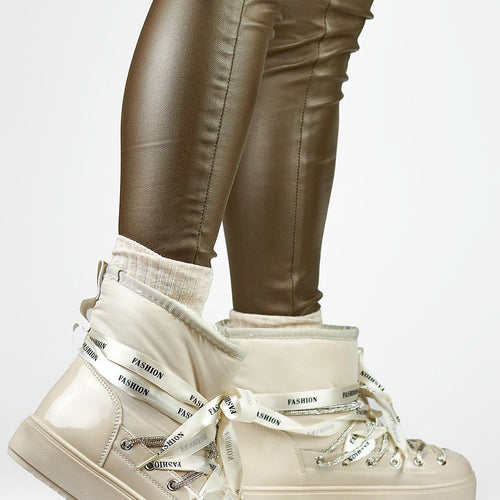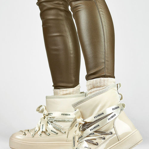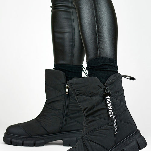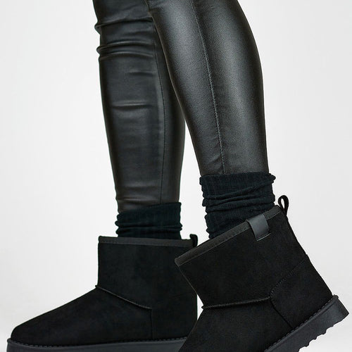 Women's snow boots with ankle-length upper. Made from a combination of textile material and eco leather. Set on a thick platform, which will perfectly insulate from the cold ground. Slip-on model with laces. The inside is insulated with fur. Perfect for cold days! You should definitely have them! fabric ~tworzywo syntetyczne warmers fur Footbed fur Upper height 14 cm Platform...