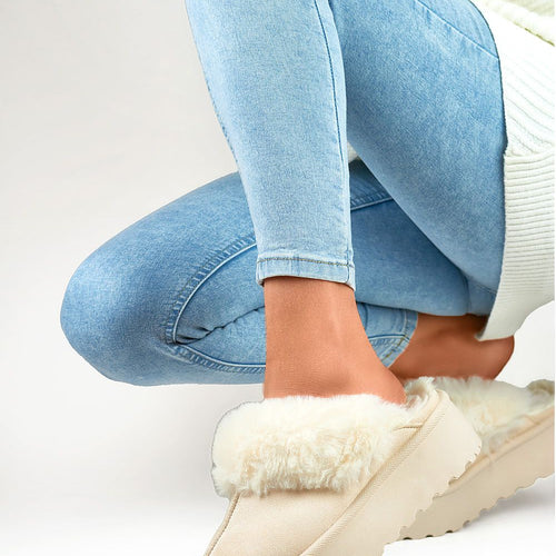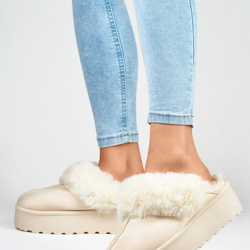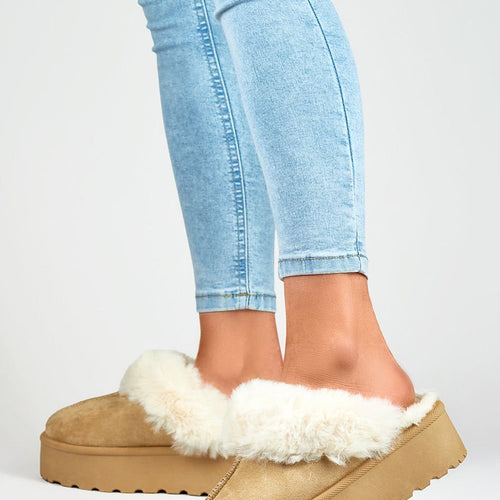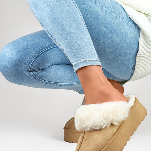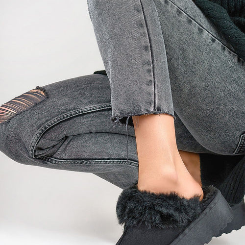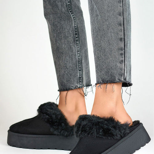 Fashionable women's slippers made of eco-suede. Set on a massive platform made of rubber material. Model insulated with fur. Rounded, covered noses. You should definitely have them! fabric imitation leather suede Footbed fur Platform height 4.5 cm Size Insole lenght 36 23 cm 37 23.5 cm 38 24 cm 39 24.5 cm 40 25 cm 41 25.5 cm