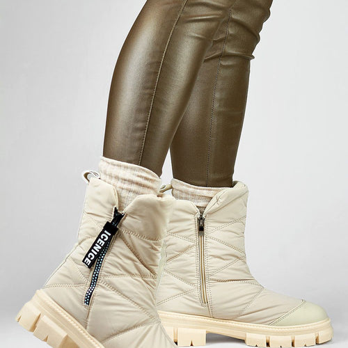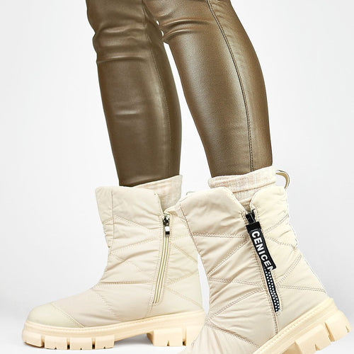 Women's snow boots set on a thick rubber sole. Made of textile material with decorative stitching. The center is insulated with fur. Zips on the sides. Perfect for cold days! You should definitely have them. fabric ~tworzywo syntetyczne warmers fur Footbed fur Upper height 20 cm Heel height 4.5 cm Size Insole lenght 36 23.5 cm 37 24 cm 38...