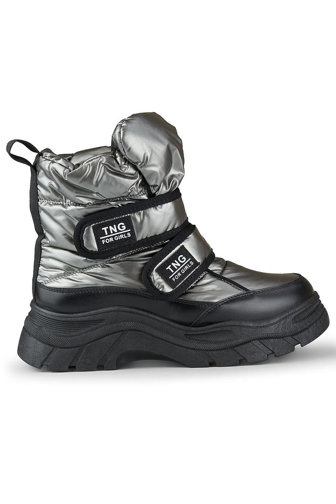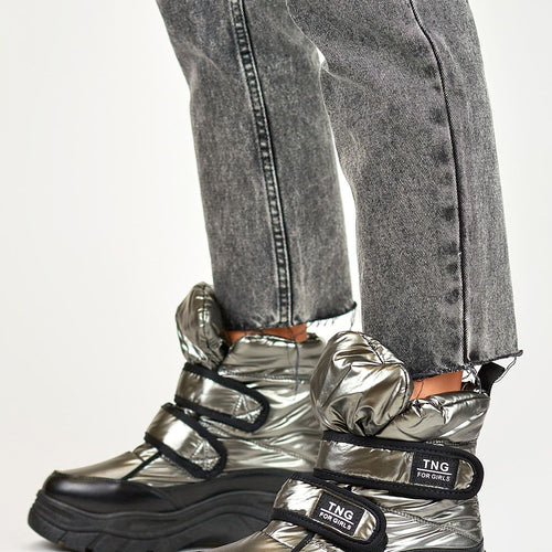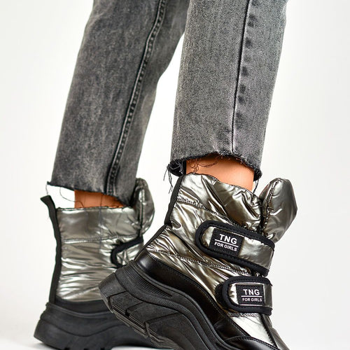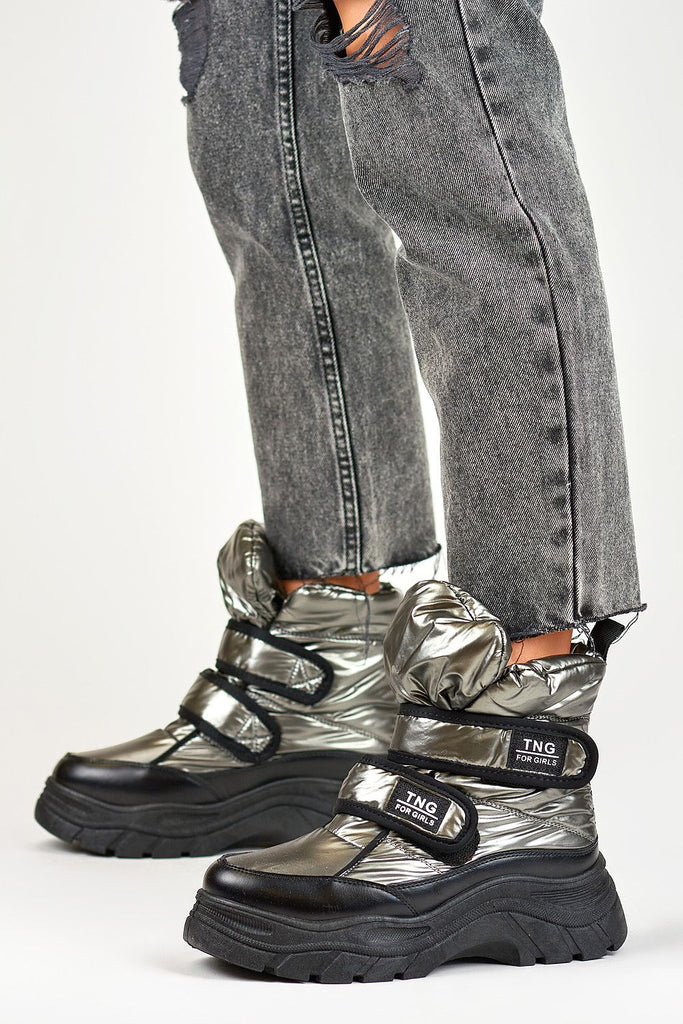 These elegant silver-colored snow boots with black accents are not only stylish, but also functional, perfect for the fall/winter season. They were designed with women in mind, combining a fashionable look and protection from the cold. The upper is made of durable textile material, which gives the shoes a modern and striking look. The upper's height of 13 cm provides...