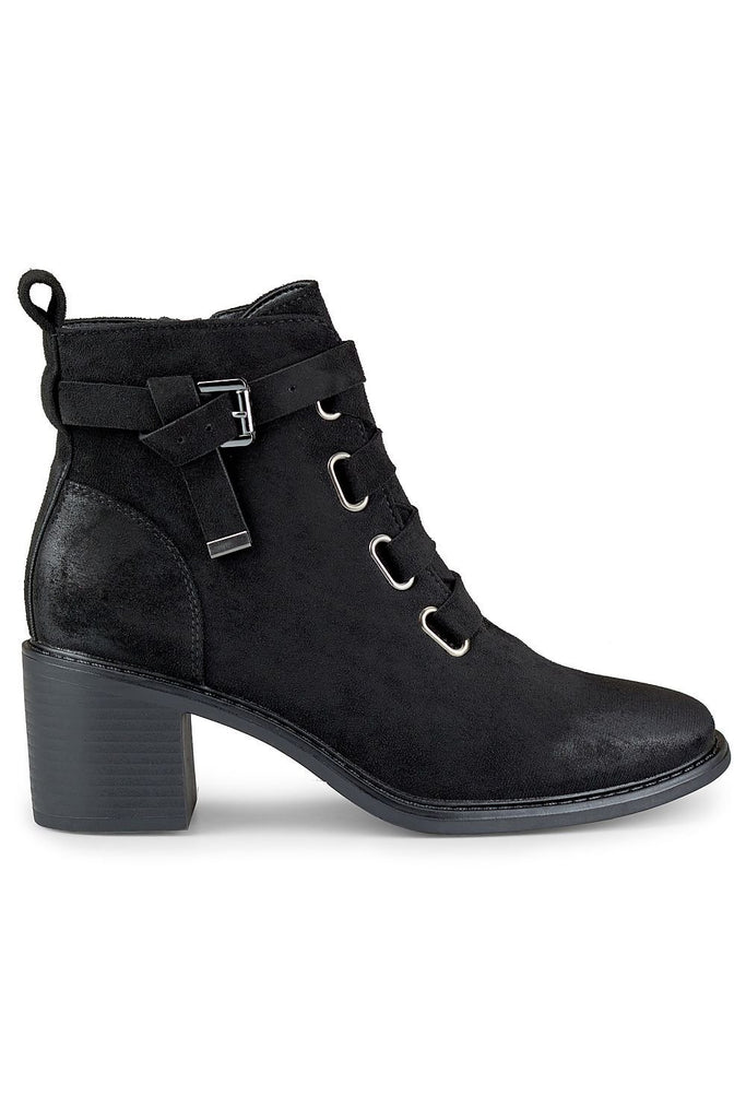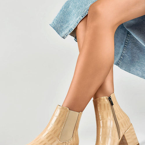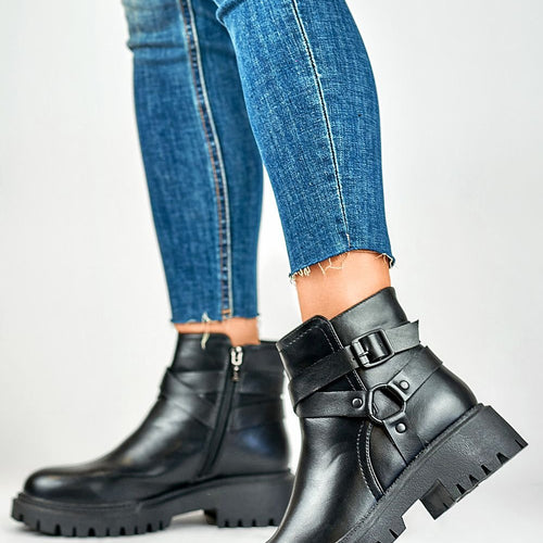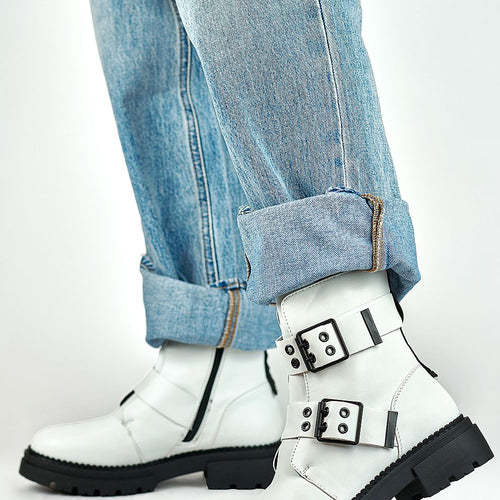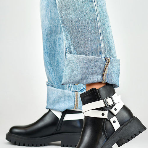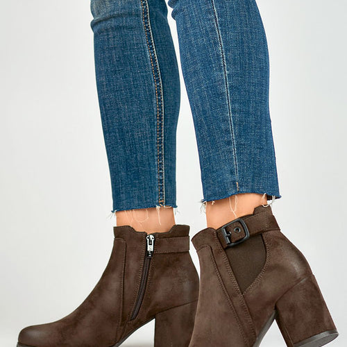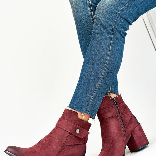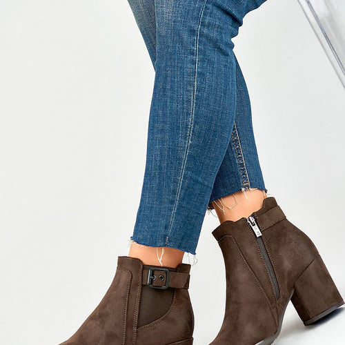 Booties made of organic suede leather. Fastened with a zipper on the inside. Set on a medium height post. Upper above the ankle on the outside decorated with an elastic rubber insert and a thin strap finished with a buckle. Lightly insulated inside. Comfortable, classic boots will complement many autumn stylings. fabric imitation leather suede warmers fur Footbed fur Upper...