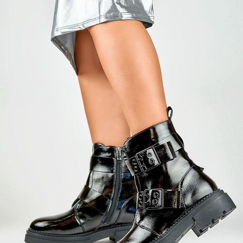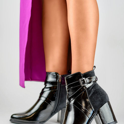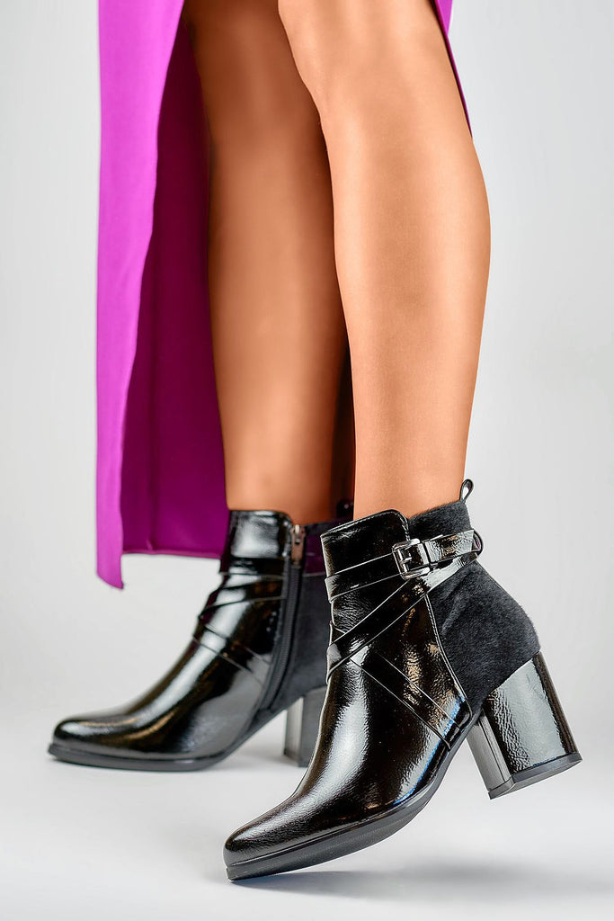 Booties made of eco-friendly patent leather. Fastened with a zipper on the inside. Set on a medium-height post. Around the ankle decorative crossed straps with a metal buckle. Lightly insulated inside. Comfortable, classic and very elegant boots will complement many autumn stylings. fabric ~skóra ekologiczna lakierowana plus tkanina warmers fur Footbed fur Upper height 11 cm Heel height 6.5 cm...