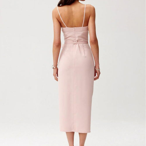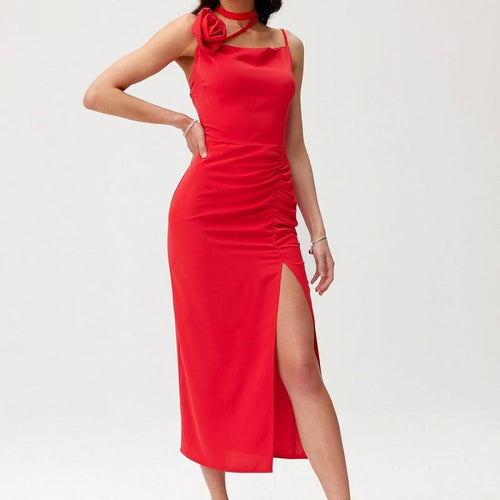 Maribel dress is a model of midi dress on thin straps, which tastefully exposes the shoulders and back. The free-flowing, straight neckline adds class and chicness. Sexy slit on the leg and draping at the top of the skirt will make you feel very feminine. The dress has a decorative rose element, which you can use in many ways, tie...