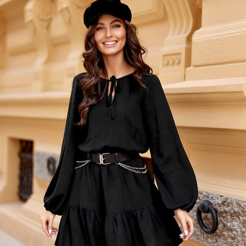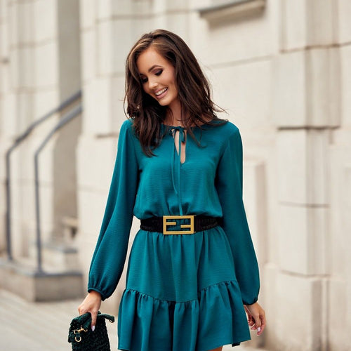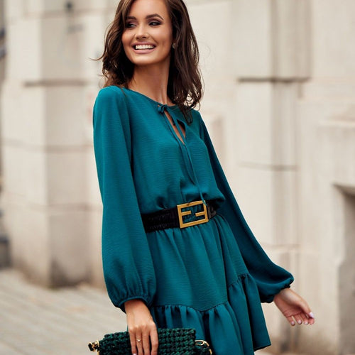 An uncommonly charming and noteworthy women's knee-length dress with loose long sleeves ending in an elastic band. The cut-off at the waist with an elastic band and the very impressive ruffles at the bottom of the dress and the binding at the top of the front add to its charm. The blushed solid dress is a great idea for a...