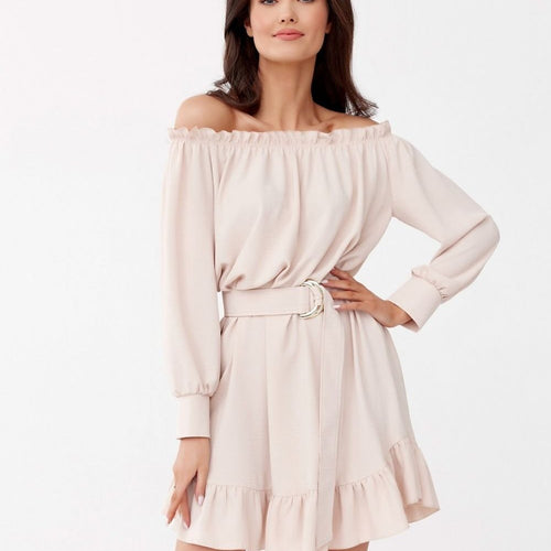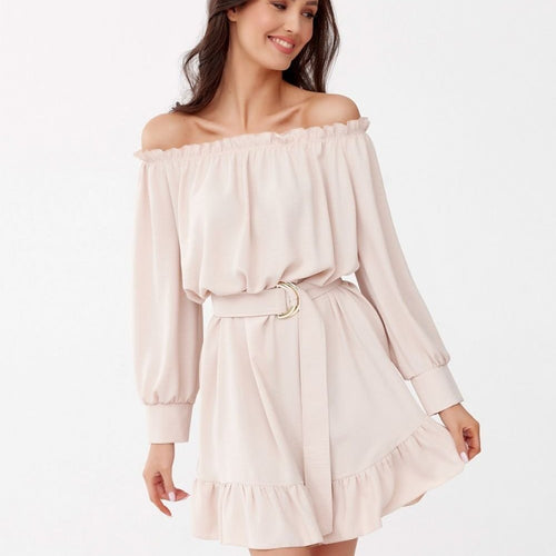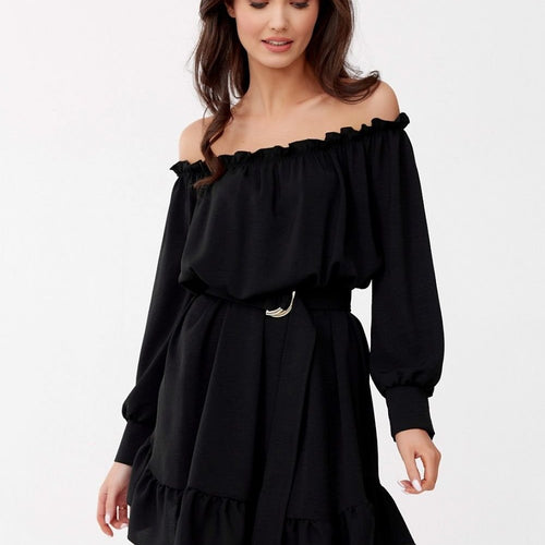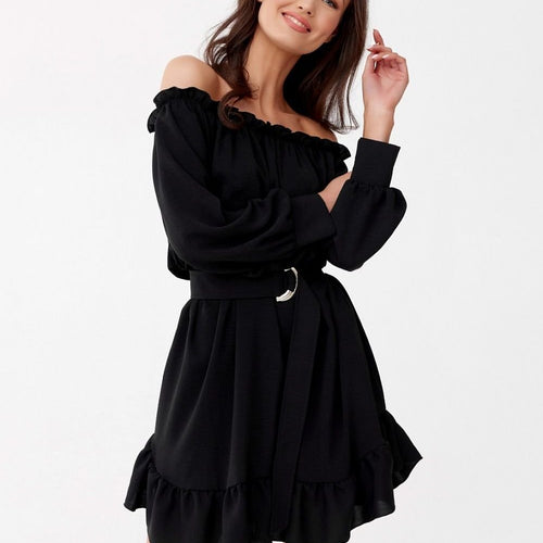 The dress features a beautiful Spanish neckline and long, wide sleeves finished with a cuff. The loose cut provides exceptional comfort, and the elastic band at the shoulders prevents slipping. The bottom of the dress was decorated with a striking ruffle. The loose, feminine cut looks great on the figure and provides great comfort in wearing. A belt is attached...