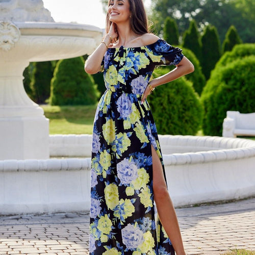 The dress features a Spanish neckline that reveals the shoulders. It is covered with a demented floral print with an elastic waistband to accentuate the waist area. The bottom is finished with a two-tier ruffle. The frill at the neckline also overlaps the shoulders and back. In addition, it forms short sleeves. The whole is finished with a delicate fabric,...