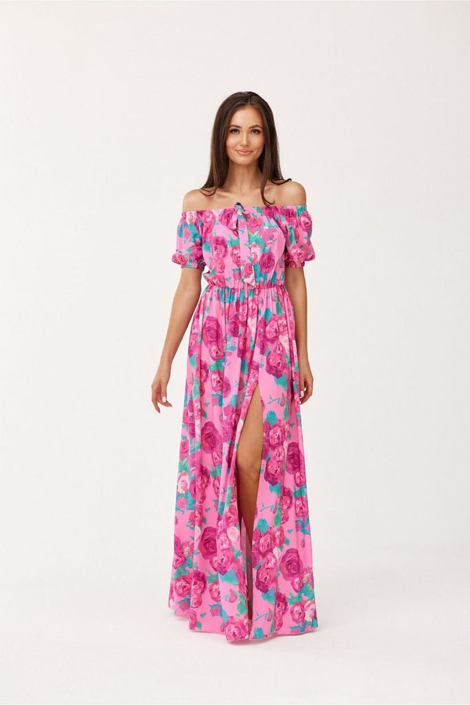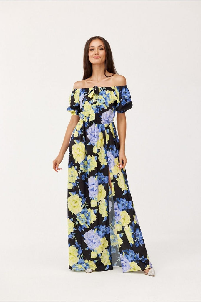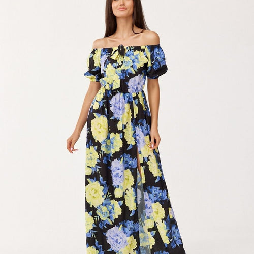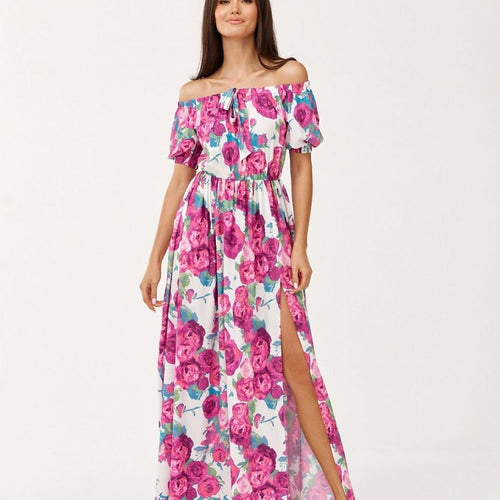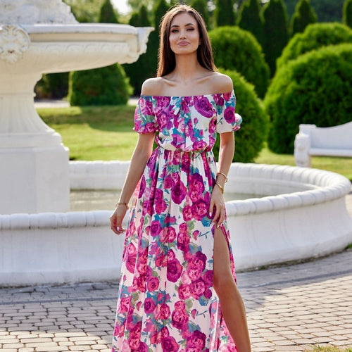 Asymmetrical maxi dress is made of soft, pleasant fabric that will provide comfort to the most demanding women. The dress is worn over the head. It is also characterized by uncovered shoulders that add to its elegant look and an asymmetrical bottom finished with a beautiful ruffle. The dress is distinguished by an elastic waistband that perfectly emphasizes the feminine...