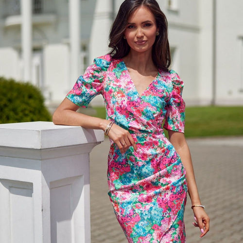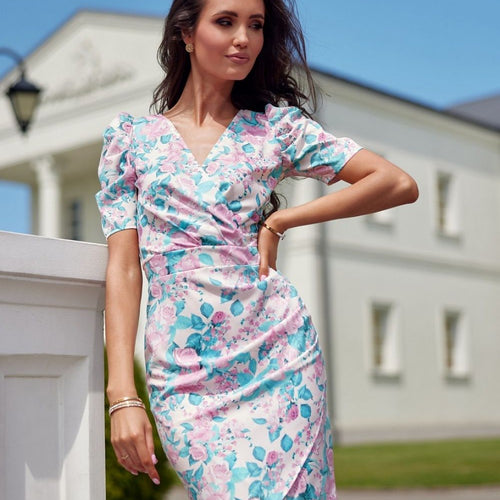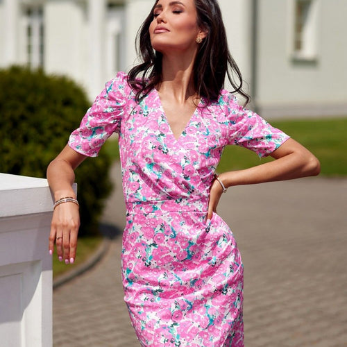 Mini dress with envelope neckline and short sleeves is made of very good quality fabric that will be comfortable to wear. The short dress is characterized by short ruffled sleeves and creases along the torso. The dress is also distinguished by its envelope neckline and overlapping bottom. It also features beautiful patterns that will appeal to everyone. The pre-knee length...