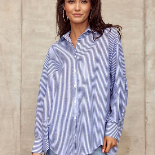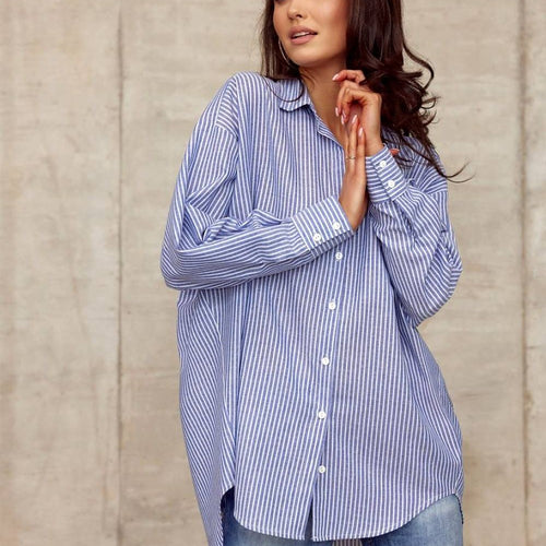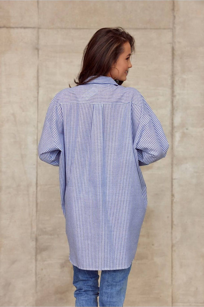 A beautiful and extremely striking women's shirt with long buff sleeves ending at the end with fashionable wide buttoned cuffs. The striped women's shirt is distinguished by its oversize cut, which will guarantee comfort and ease of wear. The button-adjustable closure will allow you to adjust the neckline independently. The shirt is characterized by a loose cut, which will hide...