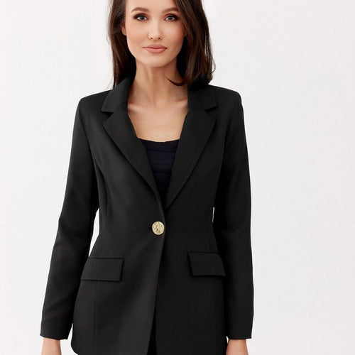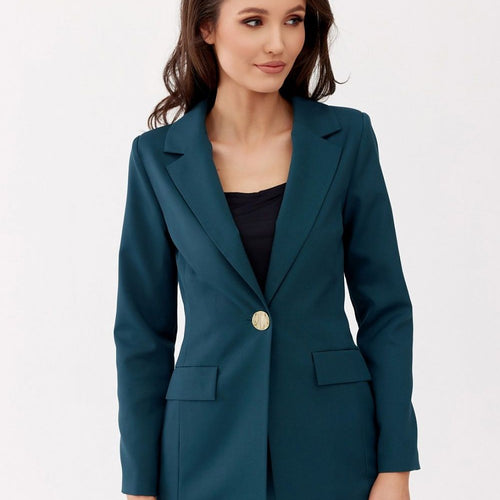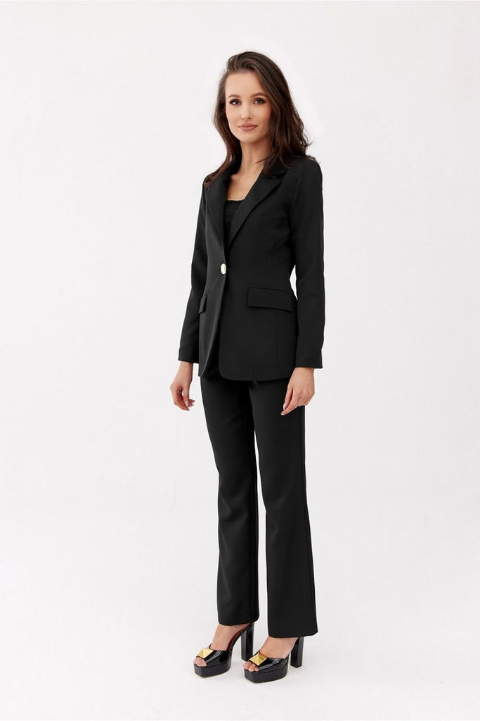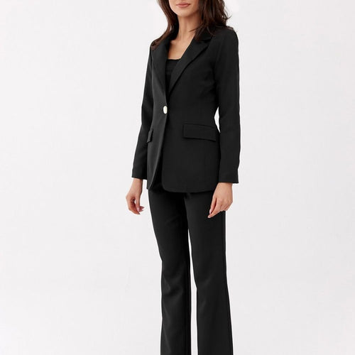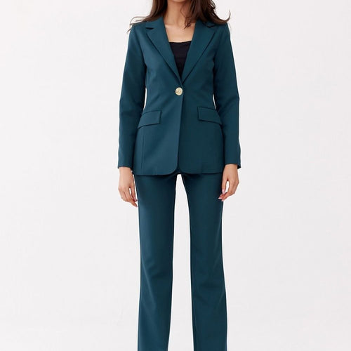 Elegant jacket with the right length for pants. Striking finish gives a stand-up collar with an elegant cutout. Cut off at the waist on the side. The length of the jacket reaching the hip line. The jacket has a lining, which does not restrict movement and is blended in color with the tone of the whole suit. It fastens with...