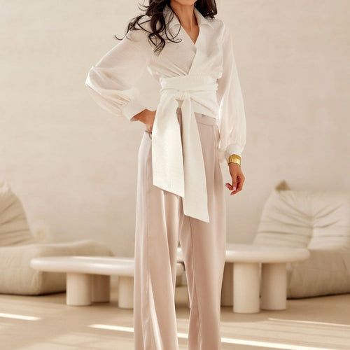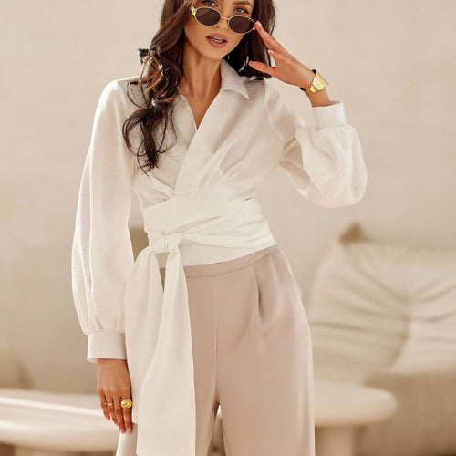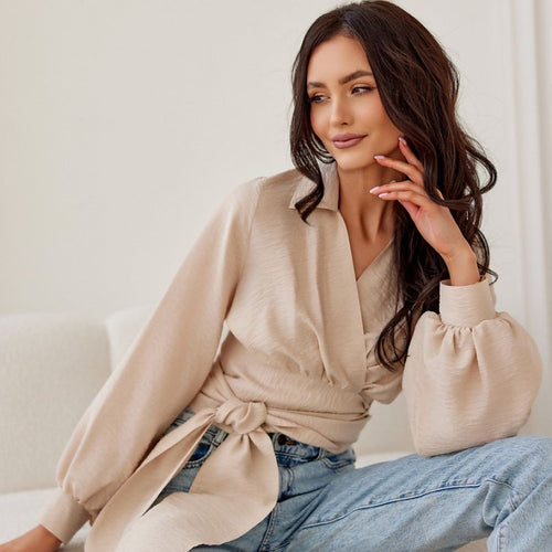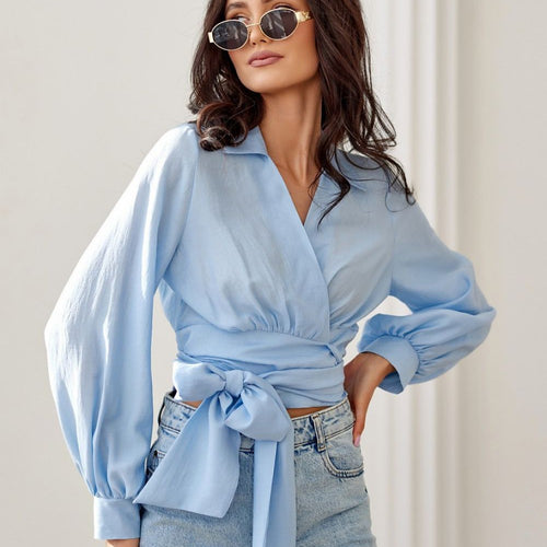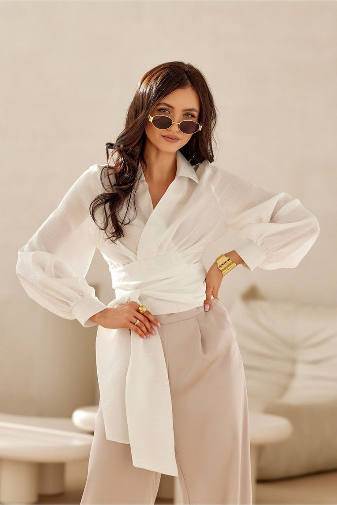 Short blouse with a collar and wrap neckline, with a tie at the waist and long, puffy sleeves. Cropped length model. Nylon 15 % Viscose 85 % Size Chest 36 88 cm 38 92 cm 40 96 cm