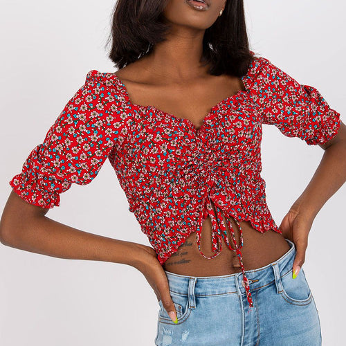 Short blouse in a fitted cut, with short sleeves. Blouse with a v-neck, creases and binding on the front. Viscose 100 % Size Chest L 91 cm M 86 cm S 82 cm