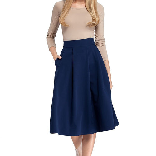 Flared midi skirt with pleats is a great choice for any occasion! Model features pockets hidden in side seams. The skirt has a well-defined waistline. Unlined and with a zip at the back. Polyester 97 % ~Spandex 3 % Size Lenght Hips width Waist width 36 74 cm 96 cm 72 cm 38 74 cm 100 cm 76 cm 40...