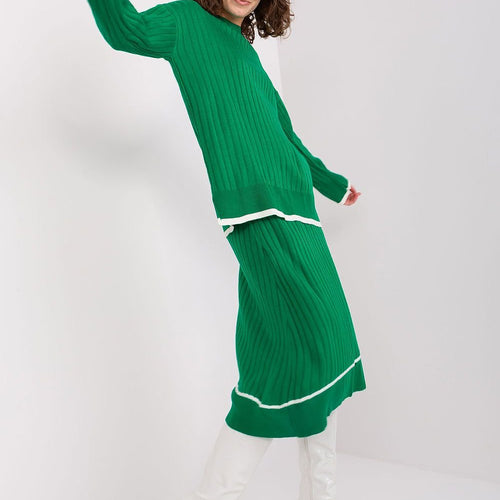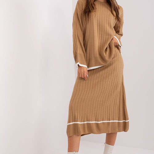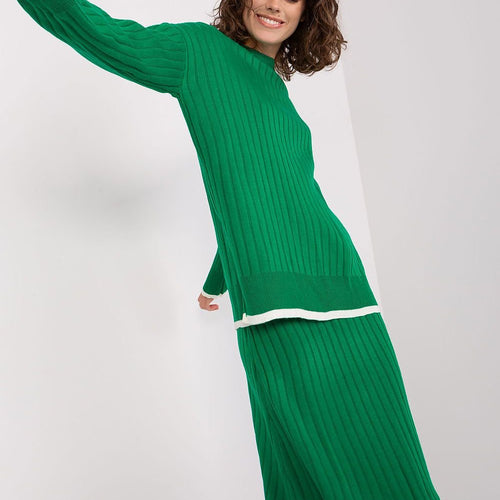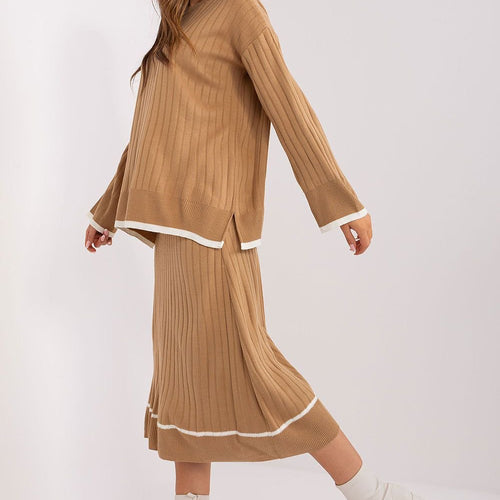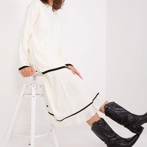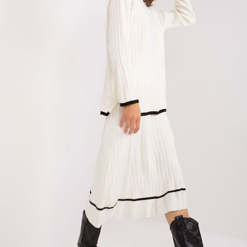 If you are looking for a unique set that combines comfort with a fashionable touch, this knitted set will meet your expectations. The sweater impresses with its unusual design, where the sleeves and hem are finished with a contrasting color. This is a subtle accent, which gives the whole set a unique character. The skirt in the set looks extremely...