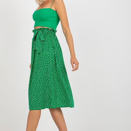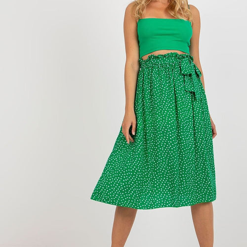 A flared skirt made of fabric in green color. The skirt has a tie at the waist. Viscose 100 % Size Waist width L/XL 84-96 cm S/M 72-86 cm
