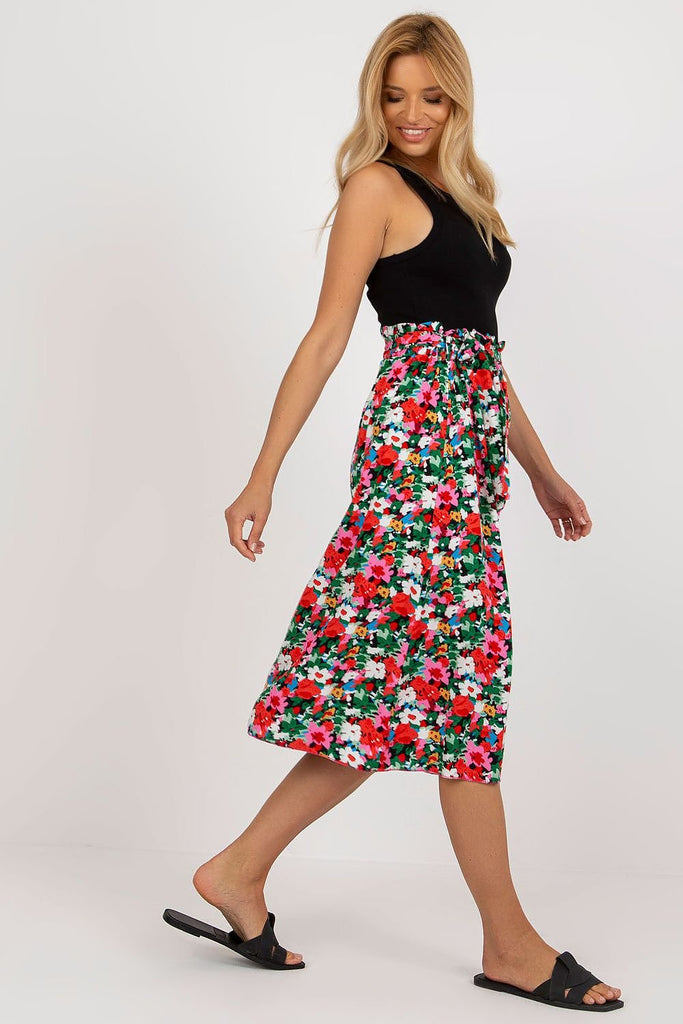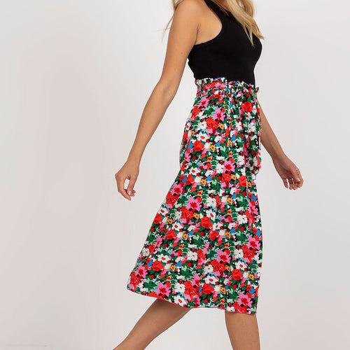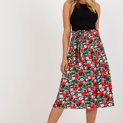 A flared skirt made of floral fabric. The skirt has a tie at the waist. Viscose 100 % Size Waist width L/XL 84-96 cm S/M 72-86 cm
