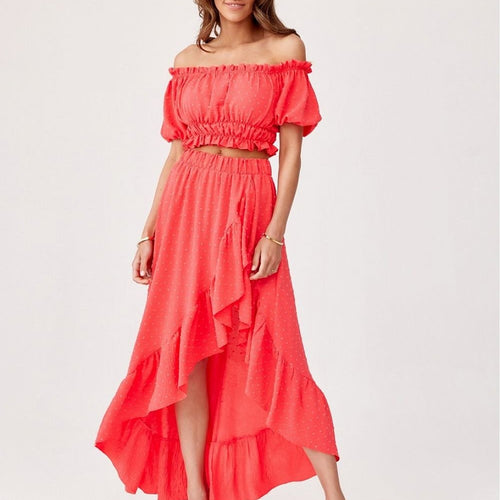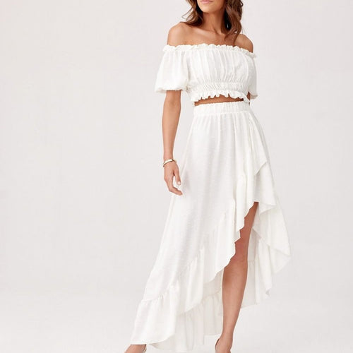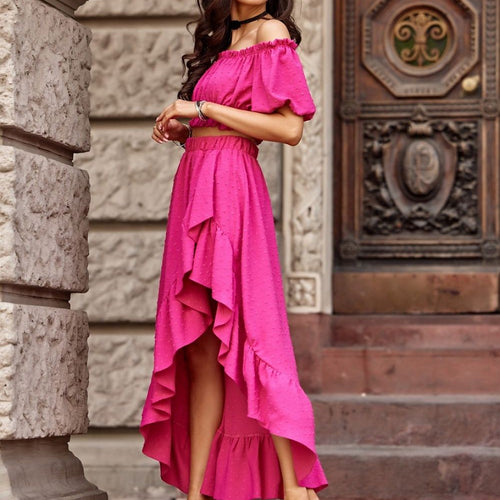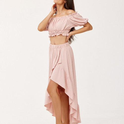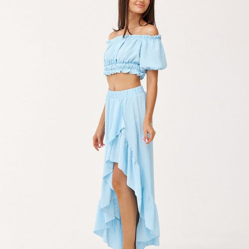 The asymmetrical blouse and skirt set is made of soft, pleasant fabric that will provide comfort to the most demanding women. The set includes a short top and an asymmetrical skirt. The top is characterized by beautiful exposed shoulders and frills at the waist and neckline. The skirt, on the other hand, impresses with a wonderful asymmetrical cut, ruffles at...