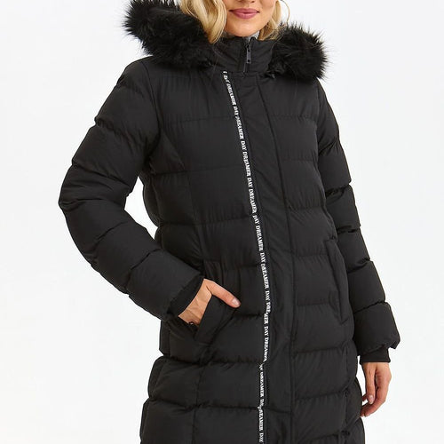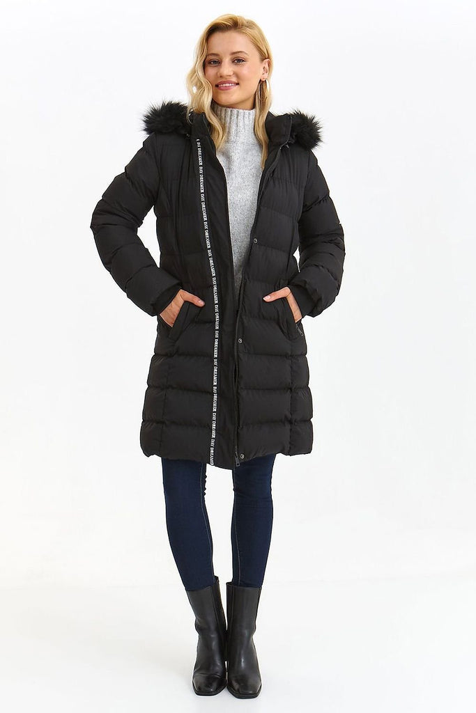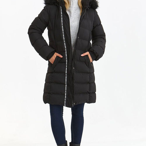 Comfortable and easy to wear longer women's straight cut jacket with straight long sleeves finished with a ribbed hem. It has an eye-catching hood trimmed with fur all around and is fastened in the front with a zipper and snaps. It is quilted all over and has practical pockets on the sides, while a decorative band along the front slightly...