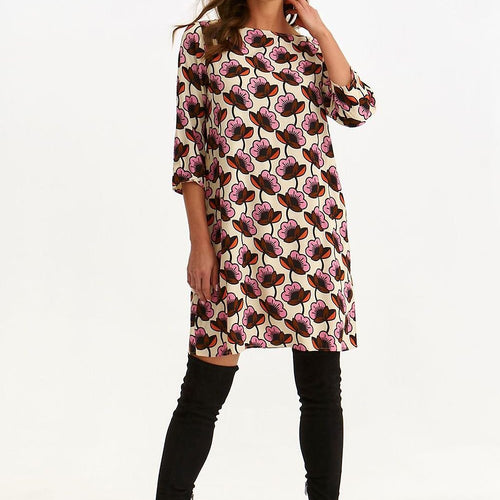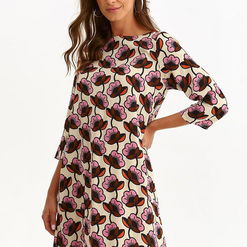Trapeze women's dress with a very loose and casual cut and a mid-thigh length. It has 3/4 length sleeves and a slightly oval neckline, being made of pleasant to the touch and good quality viscose knitwear, enriched throughout with a striking print with an image of hand-painted flowers. It can be successfully used both as an element of styling for...