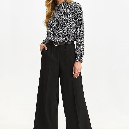 Women's pants with striking wide legs. Comfortable, featuring slip pockets and a practical tie at the waist for extra comfort. In addition, the pleats give them an elegant look. A combination of comfort and style. Polyester 100 % Size Hips width Waist width 34 102 cm 60 cm 36 106 cm 64 cm 38 110 cm 68 cm 40 114...