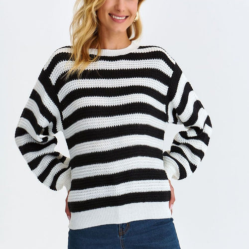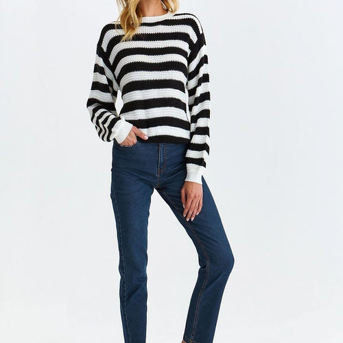 A striking boxy women's sweater in a very loose fit with straight long sleeves finished with a ribbed hem. It has a round neckline with decorative piping around it, and there is a practical ribbed hem at the bottom. It was made of pleasant to the touch and good quality acrylic fabric, being enriched with transverse stripes throughout. It looks...