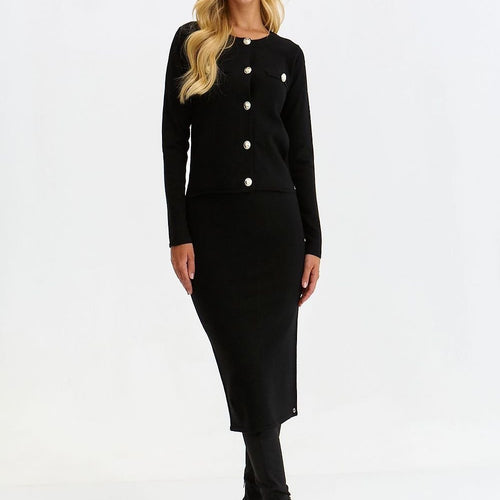 An extravagant boxy women's sweater in a straight cut with long sleeves finished with a ribbed hem. It is fastened at the front with decorative buttons and has a striking round neckline at the top, being enriched with patches with decorative buttons at the front at bust level. It was made of a pleasant to the touch and smooth knit,...