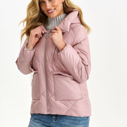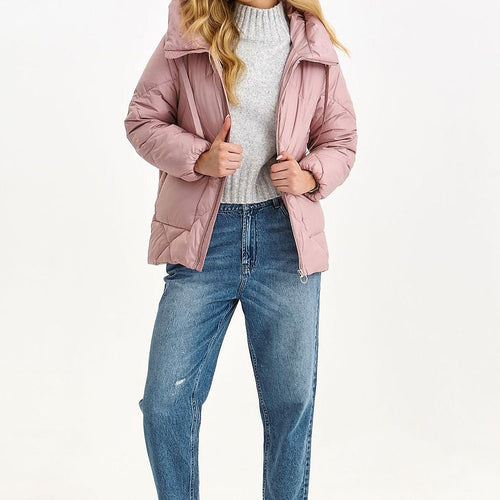 Filled with great comfort and convenience during use, this short women's jacket has long sleeves ending in a tucked hem. It has an eye-catching stand-up collar and a thick hood and is zippered at the front, with charming patch pockets on the sides with large patches. It is made of a warm and thick knit fabric, quilted all over, and...
