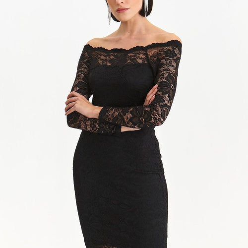 Women's mid-thigh length dress in a fitted version, which clings to a woman's figure, exposing its assets. It has uncovered shoulders and long sleeves made of fancy lace, embracing with insets of the same lace also above the bust. The dress is made of delicate and pleasant to the touch knitwear, being a great idea to complete party and outfit....