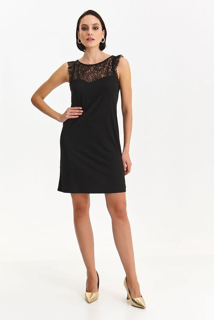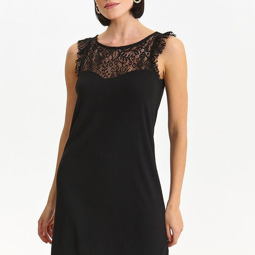Classic in its style and cut, this women's mid-thigh length dress of the little black type. It comes in a sleeveless version on wider straps with striking lace ruffles and a lace insert at the top above the bust, as well as in the upper back. It has a round neckline with delicate piping around it and is buttoned at...