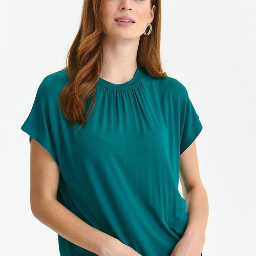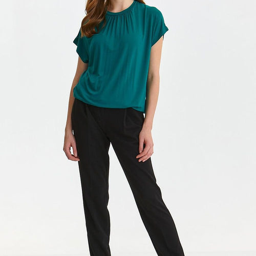 The short-sleeved blouse is an excellent choice for women who value freedom of movement and lightweight styling. Its looser cut gives it a unique nonchalance, making it ideal for summer days. The round neckline with a decorative crease adds subtle charm and originality to the blouse. It's a combination of comfort and style that will make you feel comfortable while...